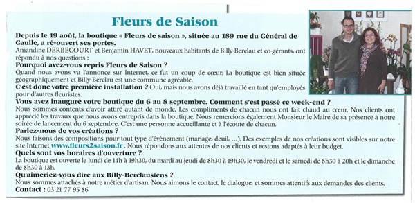 La Voix du Nord, Raconte moi Billy-Berclau, le magazine du Fleuriste. Retrouvez ici les articles sur notre aventure !