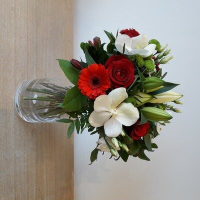Bouquet rond classique de roses et fleurs variées aux teintes contrastées rouge et vert
